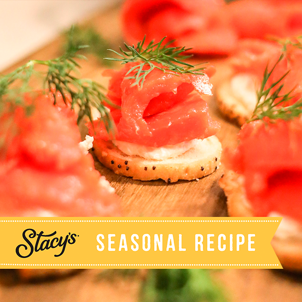 These salmon bites are a delicious and elegant appetizer, featuring succulent pieces of salmon served on a crispy Stacy's® Pita Chip base.
